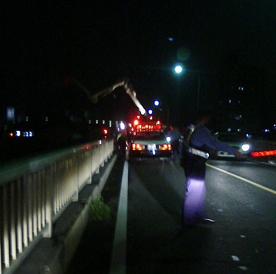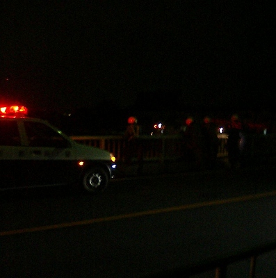 宮前橋到着。警察・消防が橋上監視活動中