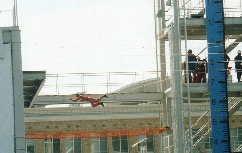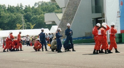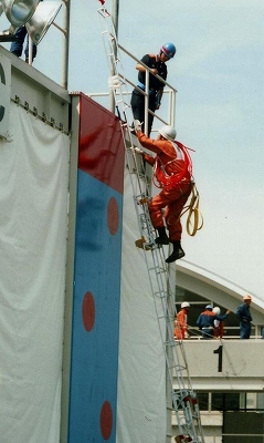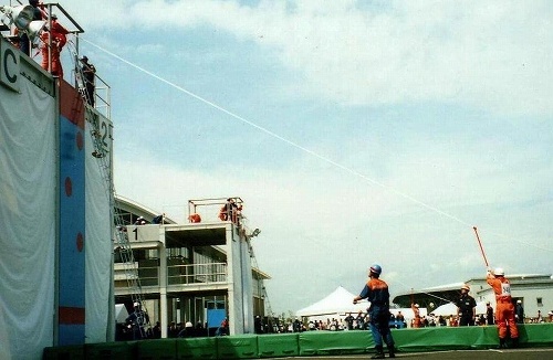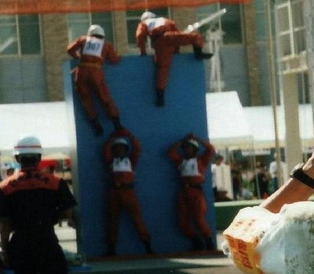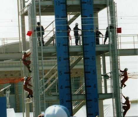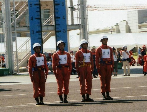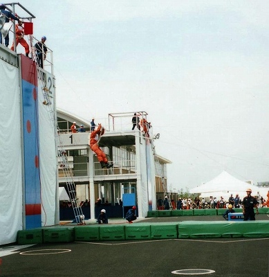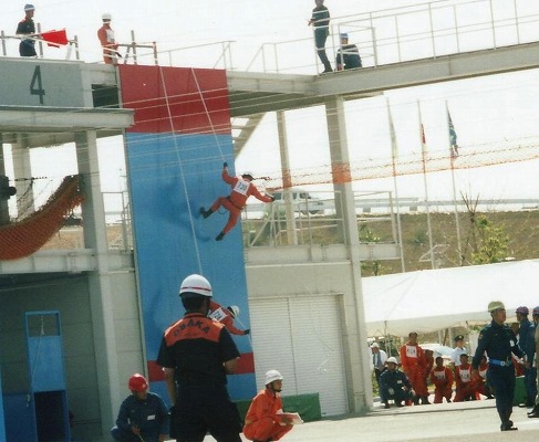 5人1組(要救助者含む)で、三連はしごを使用して高さ7メートル塔上へ進入し、