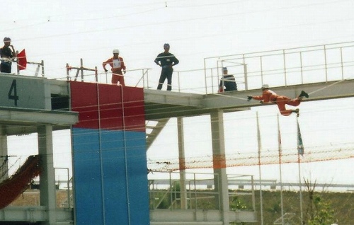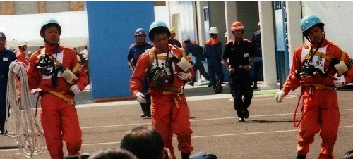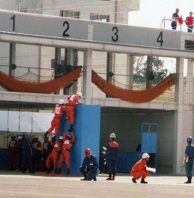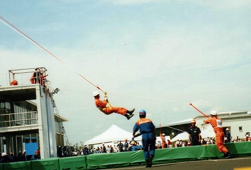 4人1組(要救助者含む)で、設定された渡過ロープにより対面する塔上に進入し、要救助者を救出ロープに吊り下げ、